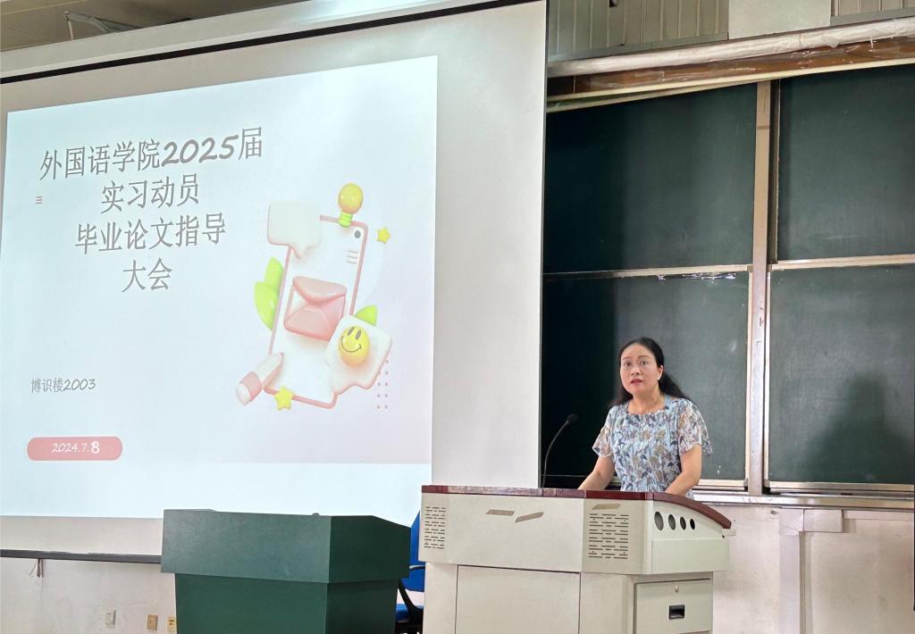 7月8日,bevictor伟德在博识楼2003召开2025届员工实习动员及毕业论文指导大会。 2021级英语专业及泰语专业同学、英语教育、泰语专业毕业论文相关负责人,考研指导教师团队相关负责人参加本次会议。公司陈静经理、马慧副经理出席大会并进行动员讲话。大会由公司英语教育实习负责人刁雪静老师主持。