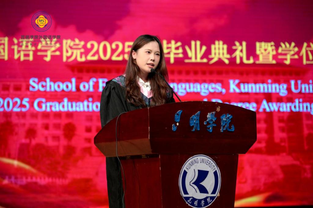 2021级泰语班周阳思雨代表毕业生发言,分享大学时光,希望同学们不忘“明德至善、知行利物”的校训、“品学兼修、修外汇中”的院训,踏上崭新征程、奔赴广阔天地。