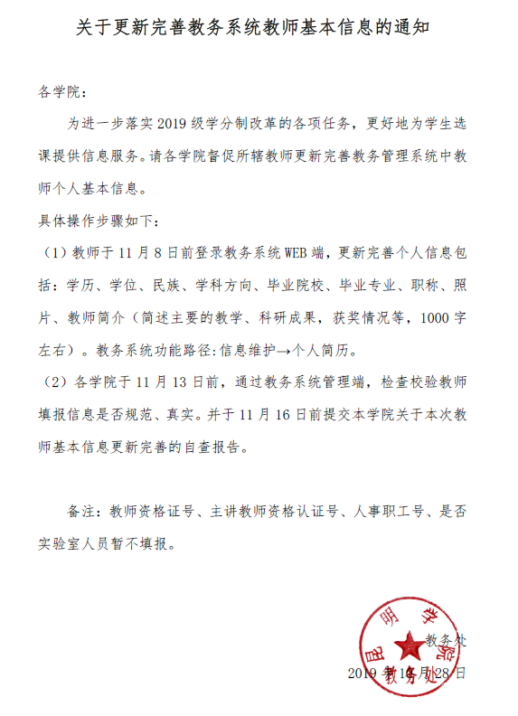 关于更新完善教务系统教师基本信息的通知