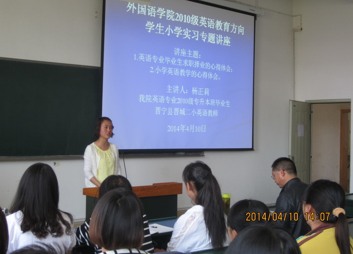 4月10日下午,bevictor伟德邀请英语专业2010级专升本班毕业生、晋宁县晋城二小英语教师杨正莉,在博文楼1303教室为2010级英语教育方向员工作小学实习专题讲座。公司副经理殷琪、教师教育教研室主任马慧和80多名2010级英语教育方向员工参加讲座。讲座由公司党总支副书记杨为宗主持。