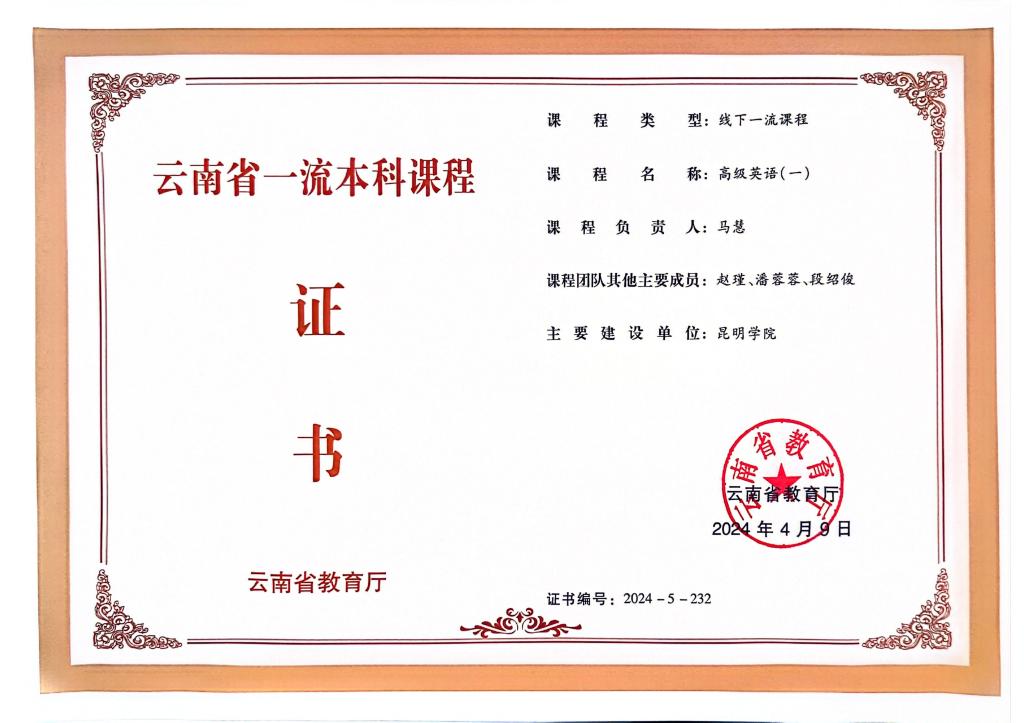 高级英语(二)省级一流课程证书