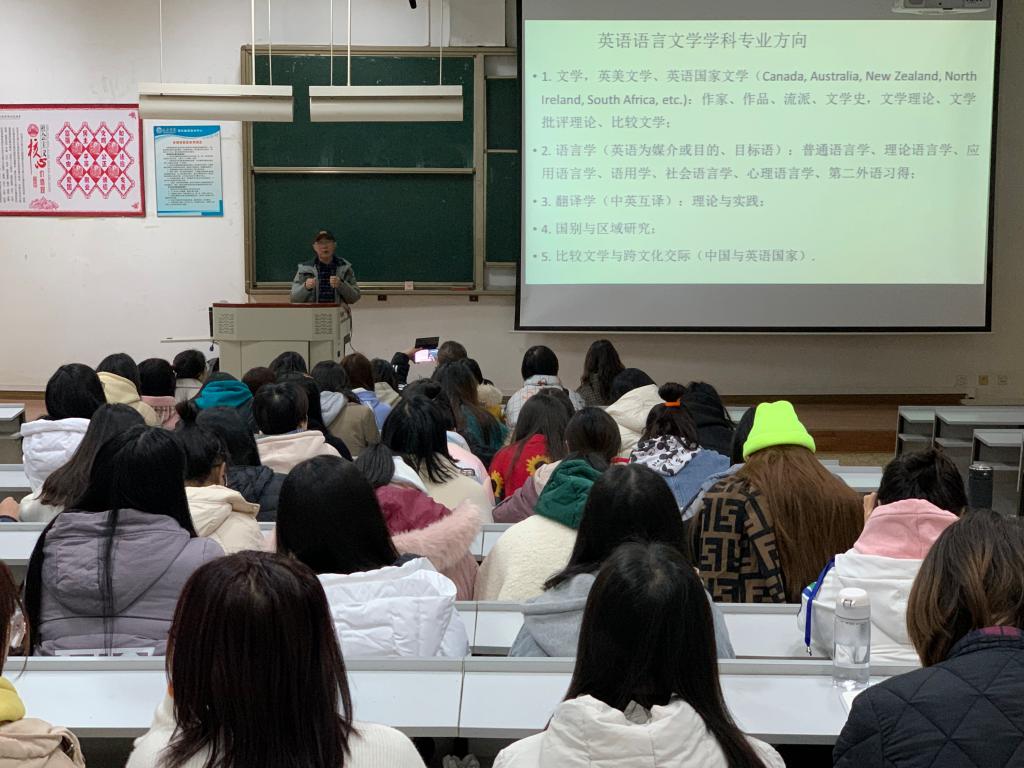 本次学术报告在博识楼1001多媒体教室举行。原一川教授主要从英语学习专业方向,教研科研指南,英语学科权威学术杂志和出版社,学界知名专家学者以及高效英语学习网站推荐五个主要方面细致全面地介绍了外语学习者在学习入门过程中必须具备的专业基础知识,同时也分析了外语学科热门的科研教研选题,为论文撰写及项目申报指明了方向。