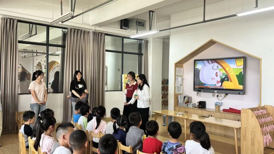 随后,党员们播放了英文儿歌《Traffic Rules》,并带领小朋友们一起跟唱。欢快的旋律和朗朗上口的歌词让孩子们在轻松愉快的氛围中学习了“stop”“go”“wait”等简单的交通规则英文词汇,实现了语言学习与安全教育的有机结合。