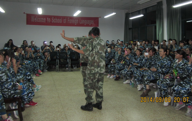 晚会伊始,穿着印有蓝、白、绿军服的新生在两名教官的带领下井井有条地走进了晚会现场,此时一股海洋般的气息立刻扑面而来。在王亚芳诙谐幽默的开场白中,晚会拉开了序幕。同时,杨老师也代表全体老师向同学们表达了节日的问候。杨老师对新生抱有很大的期望,希望他们能够践行“明德至善,知行利物”的校训,四年后做到学有所用,服务社会。