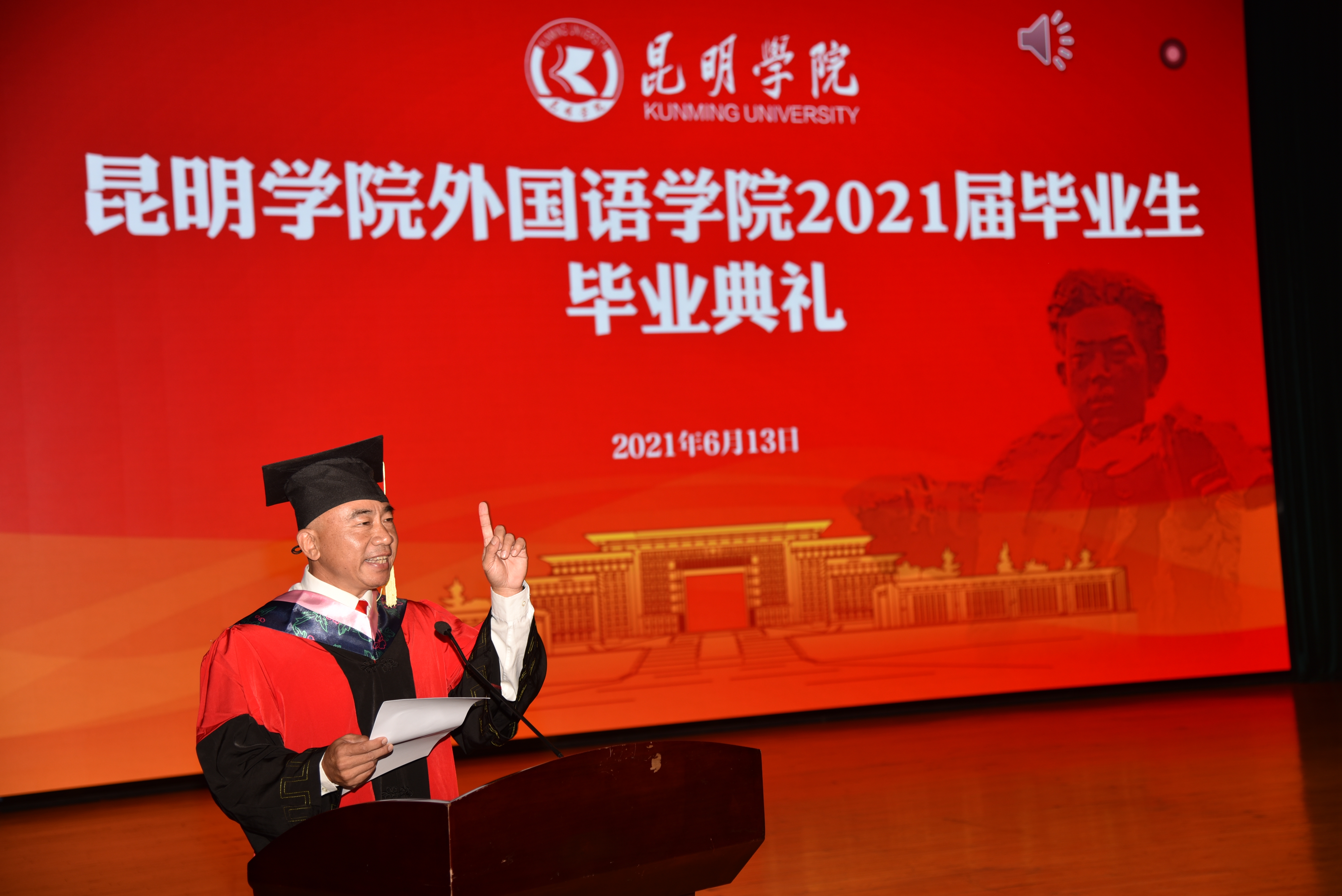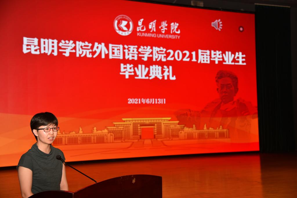 2017级商务英语专业本科生胡栖代表毕业生发言,回忆了自己在昆院生活的点点滴滴,讲述了自己求学过程和从军入伍所经历的困难与挫折,总结和回顾了自己的心路历程和取得的荣誉,并由衷地感谢老师和同学的指引和帮助,才完成对自我的全新认知。同时作为一名准研究生,他也向同学们分享了自己学习习惯和心得体会,希望大家在今后的学习、生活中继续努力、再接再厉。