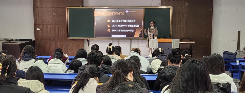 公司党委副书记翟喆从近几年外语类毕业生的就业形势、公司近三年就业情况、应届毕业生身份的界定、2024-2025学年下学期工作安排以及致2025届毕业生的一封信等方面对同学们提出了当前面临的就业问题,并结合国家就业政策进行了详细解读,鼓励公司毕业生认清当前就业形势、准确定位,积极拓宽就业视野,转变就业观念,将眼光投向市场性岗位,要积极参加宣讲会、招聘会,抓住每一次就业机会,提升自己的就业竞争力,尽早实现就业,并提醒同学们加强防范意识,警惕求职风险,确保安全就业。