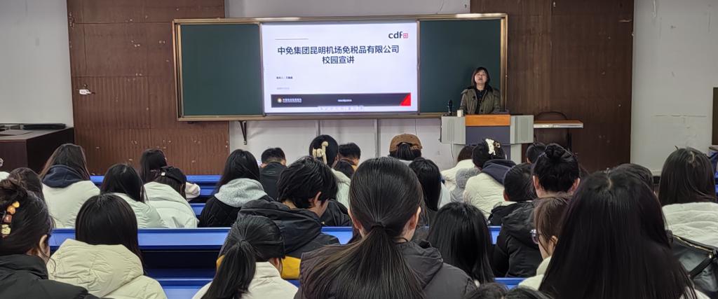 本次毕业生就业动员大会还邀请中免集团昆明机场免税品有限公司现场为同学们作宣讲招聘,万晶晶老师从企业简介、发展前景、就业岗位、薪酬待遇和面试流程方面向同学们进行详细的讲解,为公司毕业生拓宽了就业渠道,搭建了更广的就业平台。